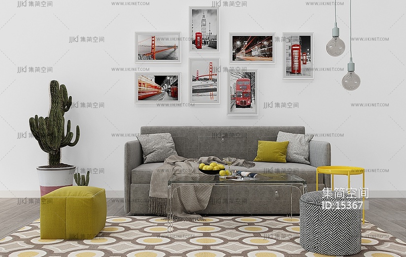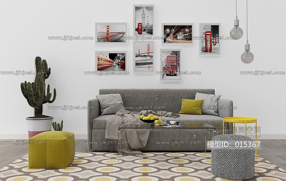 Z18-1224现代布艺沙发凳子茶几仙人掌盆栽组合 3d模型下载 [模型ID:15367]