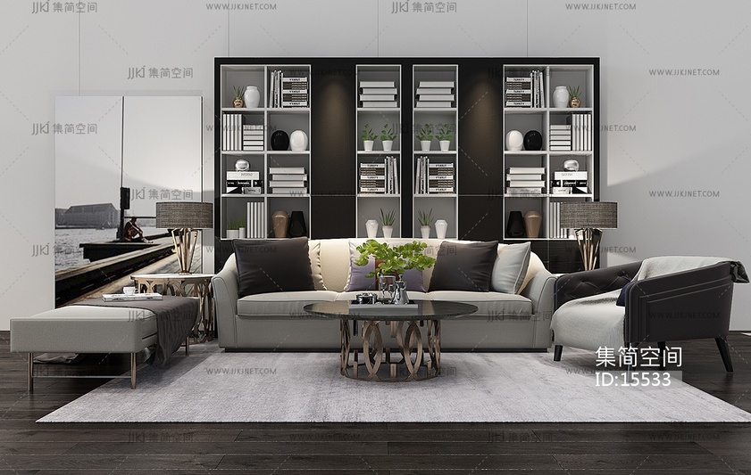 Z09-1226现代沙发茶几书柜挂画组合 3d模型下载 [模型ID:15533]