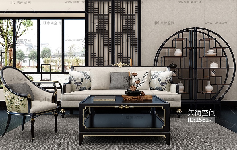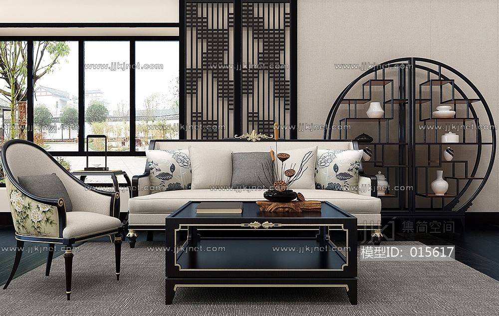 Z31-1228新中式客厅沙发茶几博古架花格 3d模型下载 [模型ID:15617]