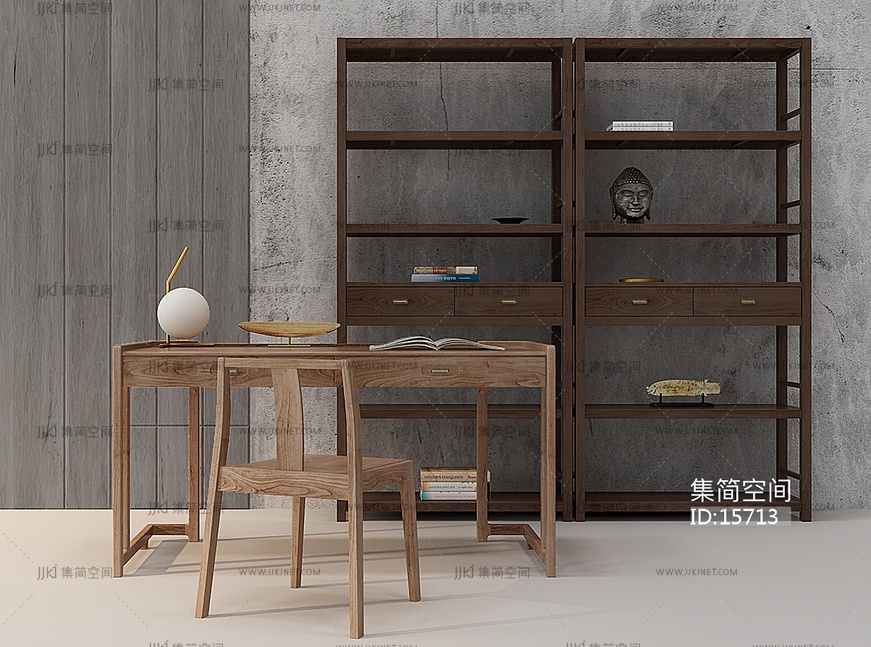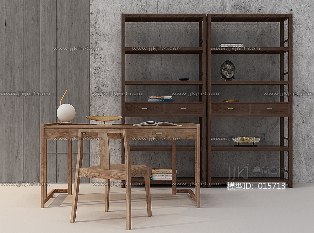 Z18-1201新中式书桌椅写字台书架书柜 3d模型下载 [模型ID:15713]