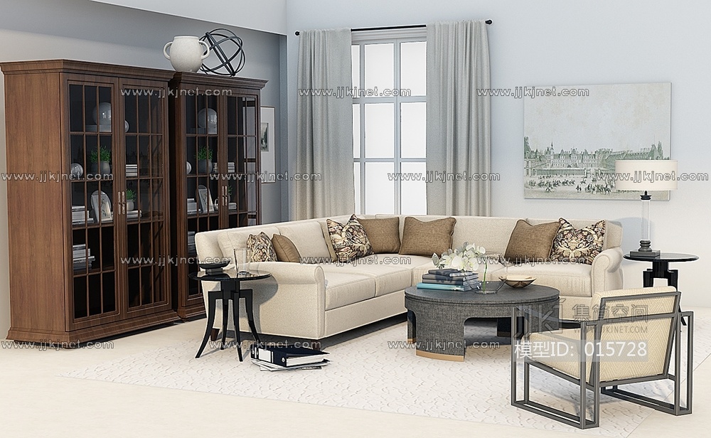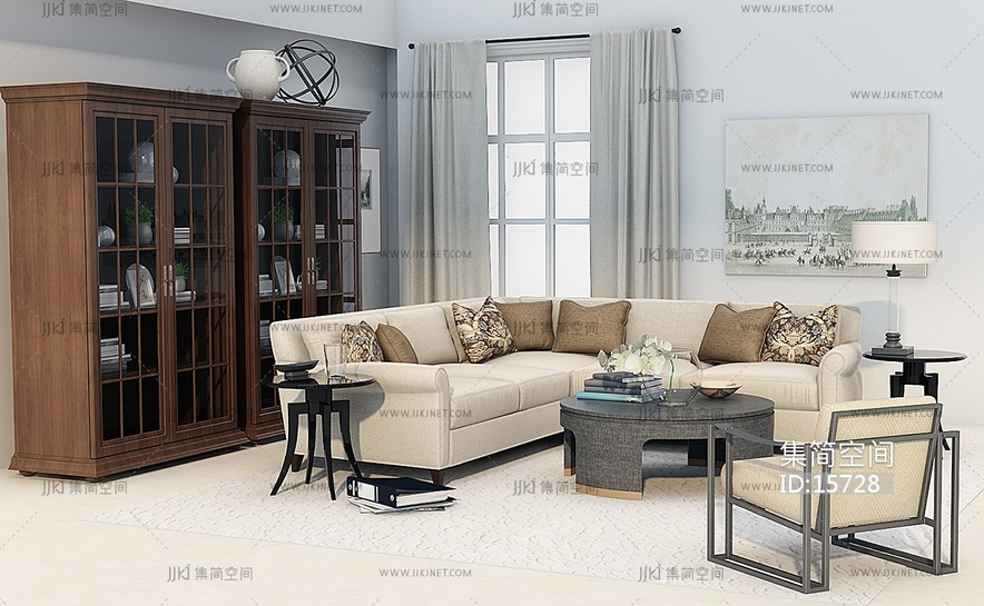 Z47-1美式沙发茶几边几书柜组合 3d模型下载 [模型ID:15728]