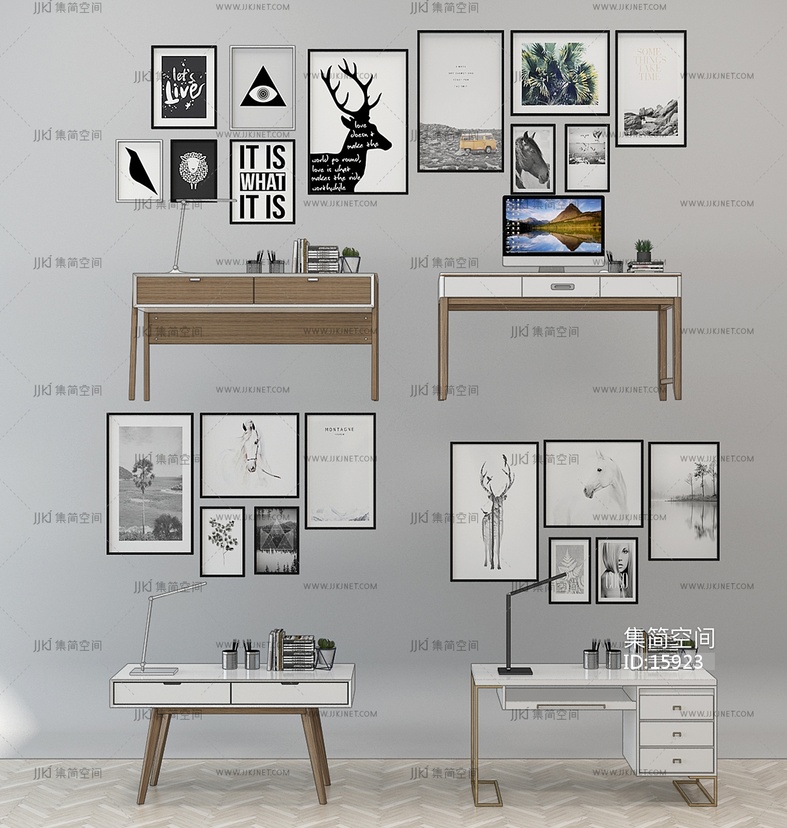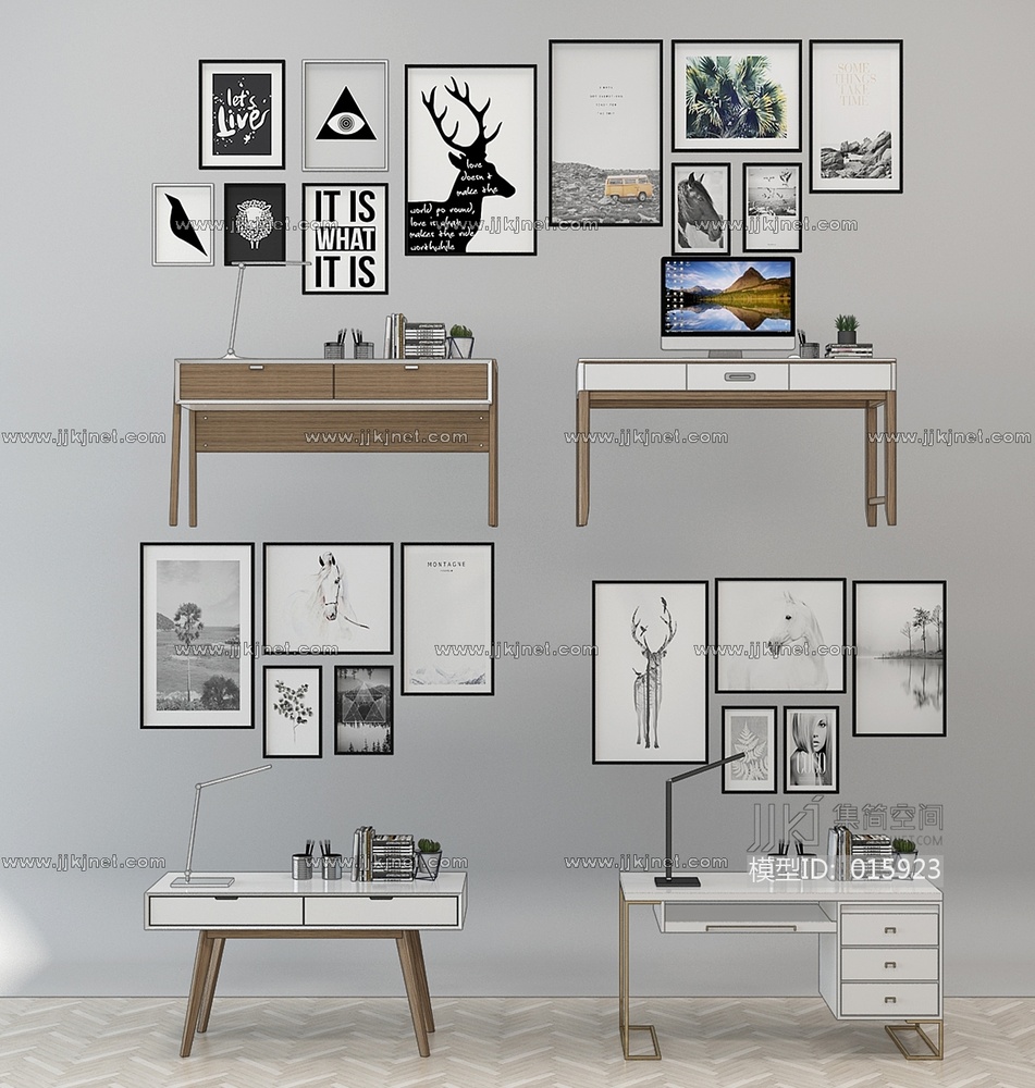 H02-0101北欧现代书桌写字台挂画组合 3d模型下载 [模型ID:15923]