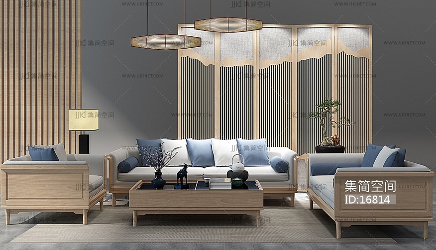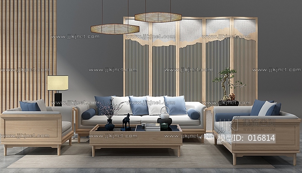 H16-0103新中式沙发茶几屏风吊灯组合 3d模型下载 [模型ID:16814]