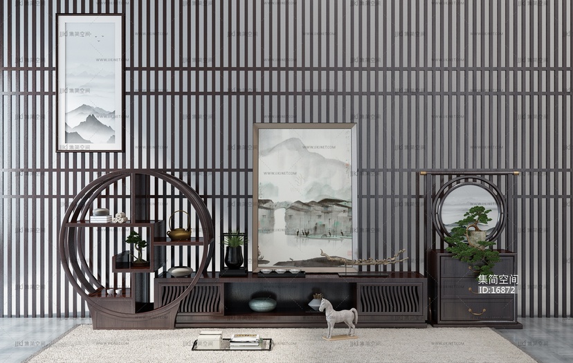 H16-0102新中式电视柜博古架摆件 3d模型下载 [模型ID:16872]