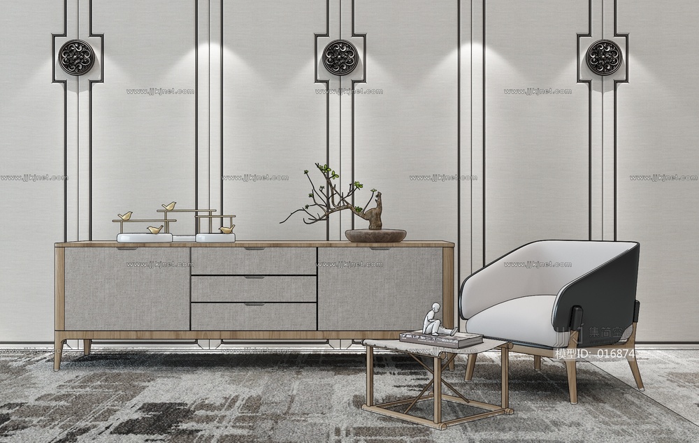H18-0102新中式电视柜单椅休闲椅脚踏摆件组合 3d模型下载 [模型ID:16874]