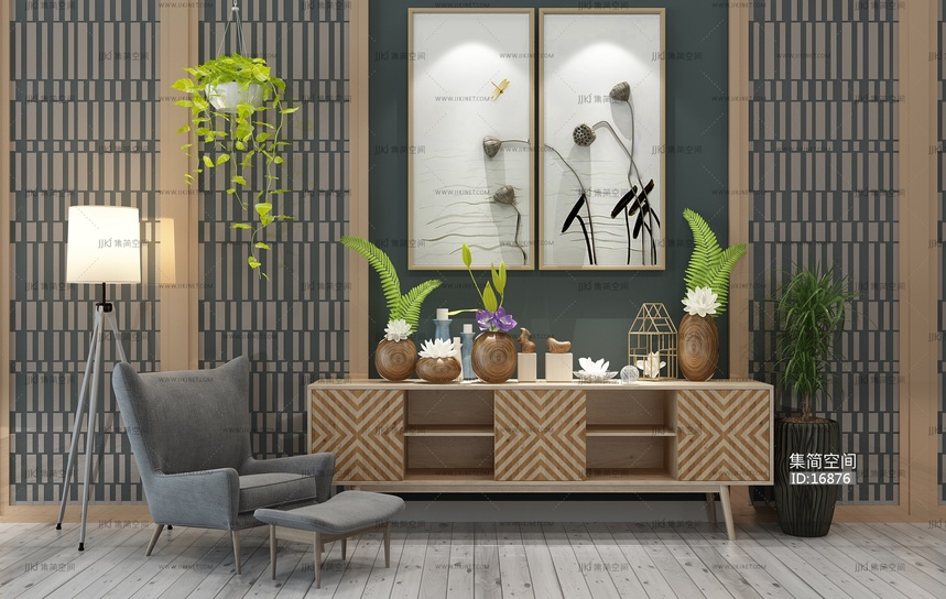 H21-0102新中式东南亚电视柜休闲椅花盆摆件挂画 3d模型下载 [模型ID:16876]