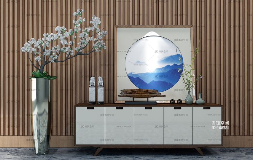 H23-0102新中式电视柜装饰柜花瓶植物盆栽摆件 3d模型下载 [模型ID:16878]
