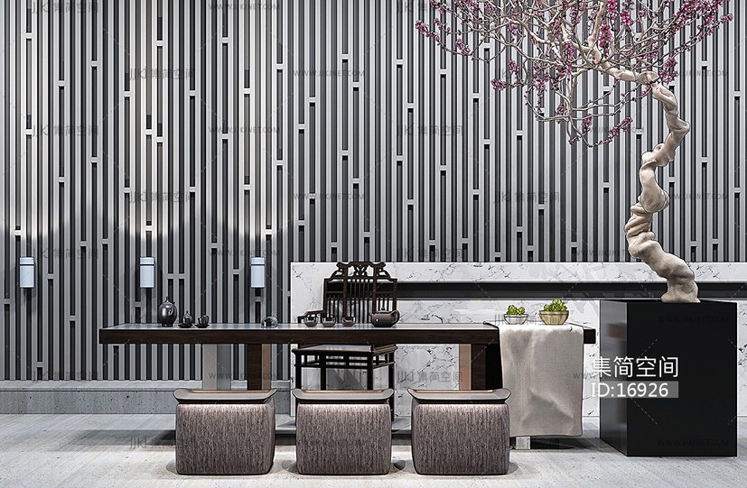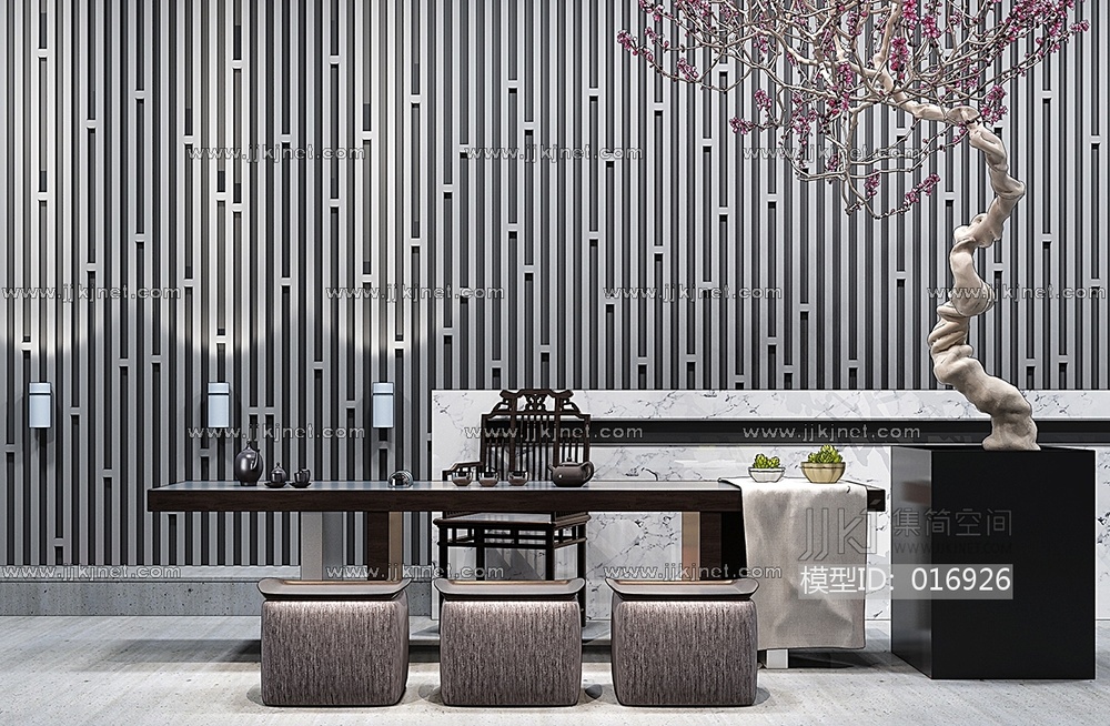 H07-0105中式茶台茶桌椅凳子盆景树组合 3d模型下载 [模型ID:16926]