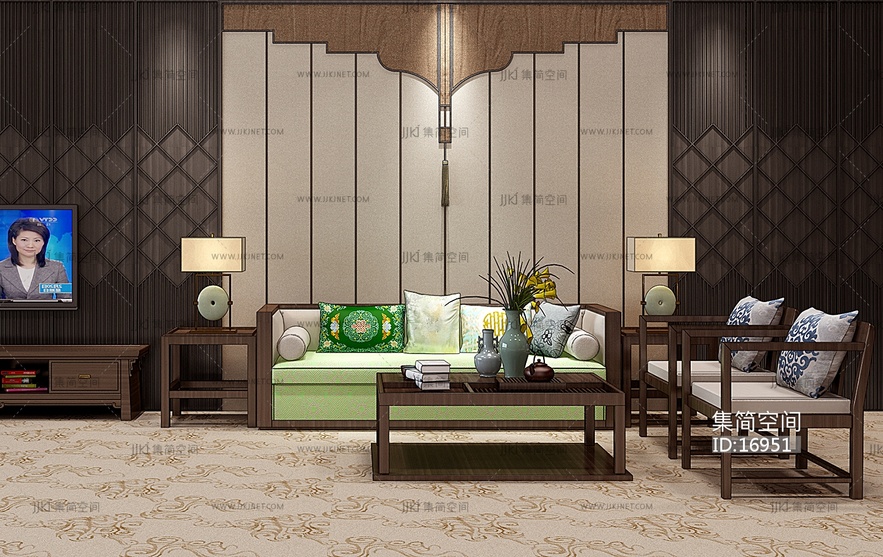 H02-0111新中式蒙古客房沙发茶几电视柜 3d模型下载 [模型ID:16951]