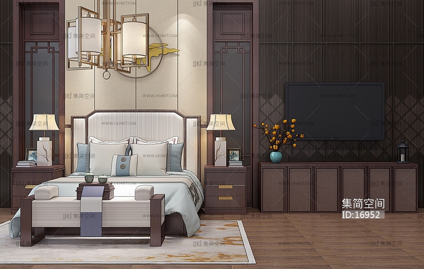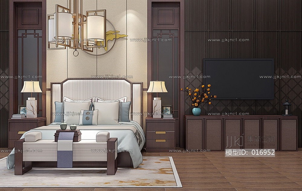 H03-0111新中式床床头柜吊灯电视柜组合 3d模型下载 [模型ID:16952]