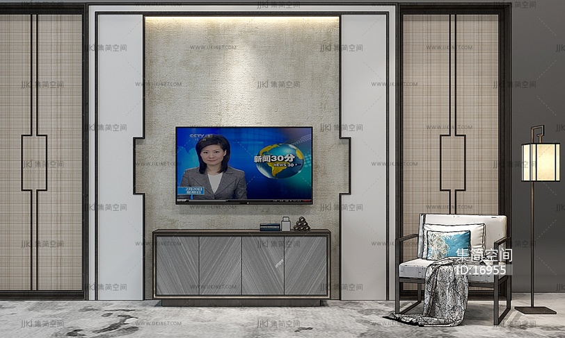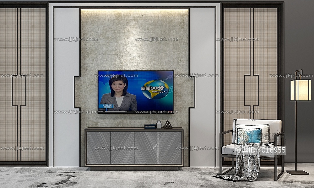 H06-0111新中式电视柜电视背景墙中式推拉门 3d模型下载 [模型ID:16955]