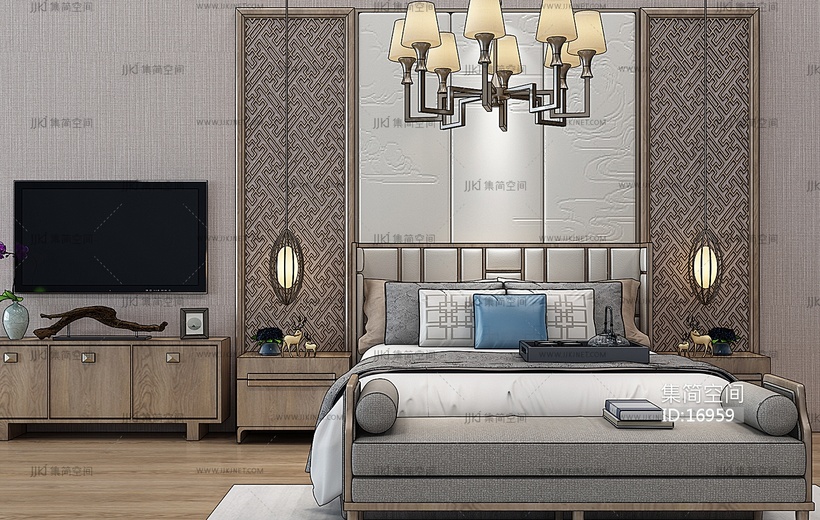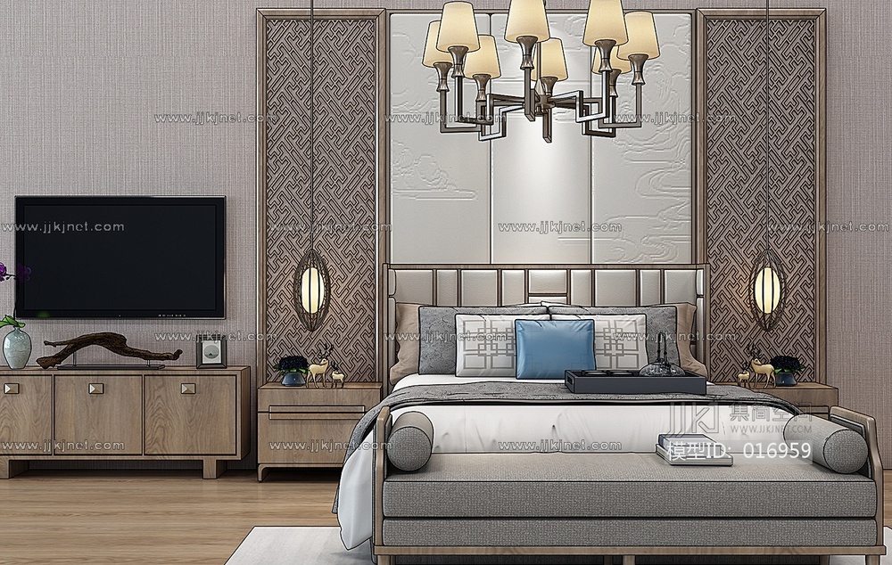 H10-0111新中式床床头柜花格电视柜 3d模型下载 [模型ID:16959]