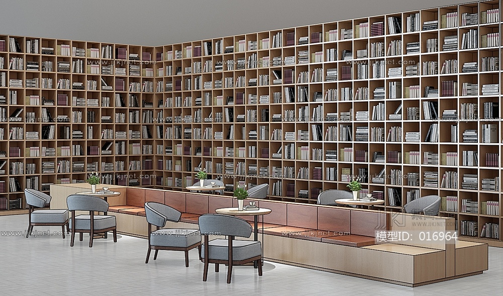 H15-0111图书馆书柜阅读区休闲卡座座椅 3d模型下载 [模型ID:16964]
