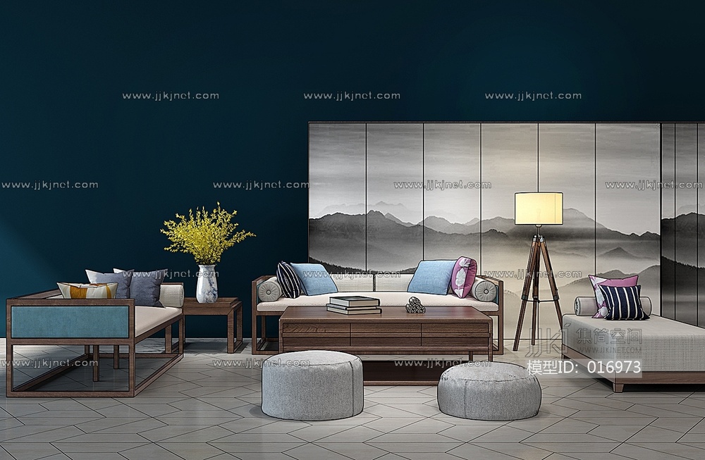 H05-0112新中式沙发茶几罗汉床屏风组合 3d模型下载 [模型ID:16973]
