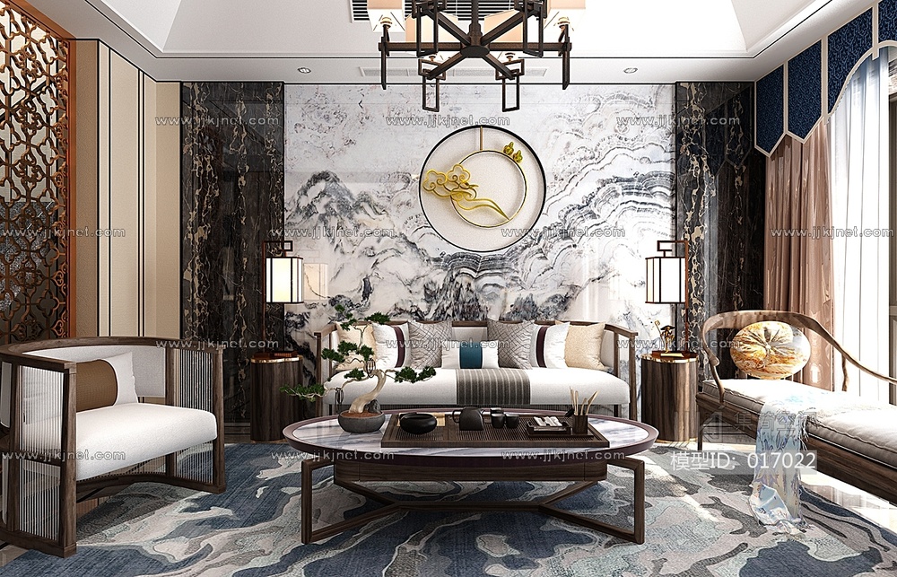 H08-0115新中式客厅沙发茶几窗帘躺椅摆件 3d模型下载 [模型ID:17022]