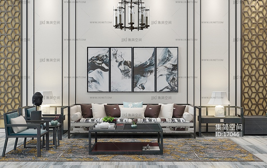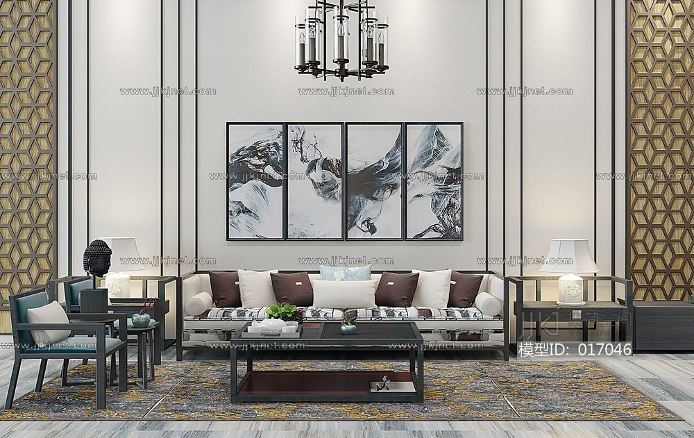 H15-0116新中式沙发茶几边几台灯椅子花格组合 3d模型下载 [模型ID:17046]