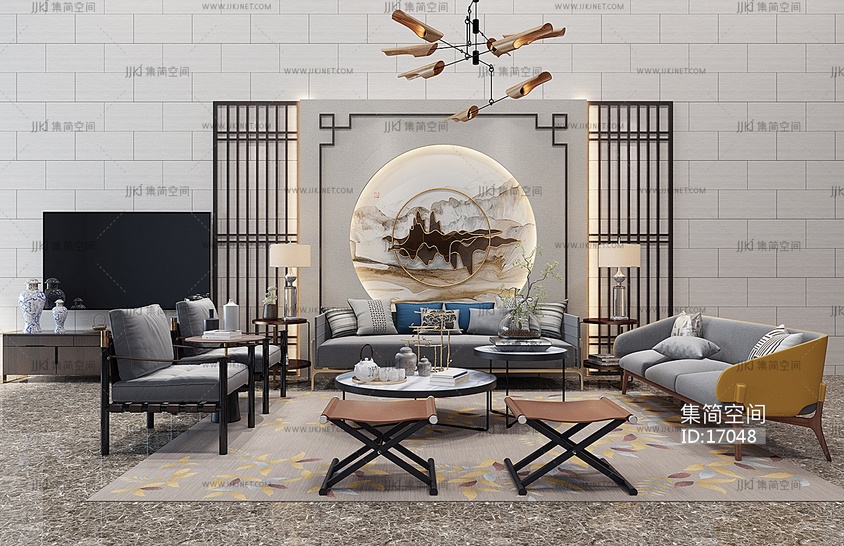 H17-0116新中式沙发茶几电视柜沙发背景墙饰品摆件 3d模型下载 [模型ID:17048]