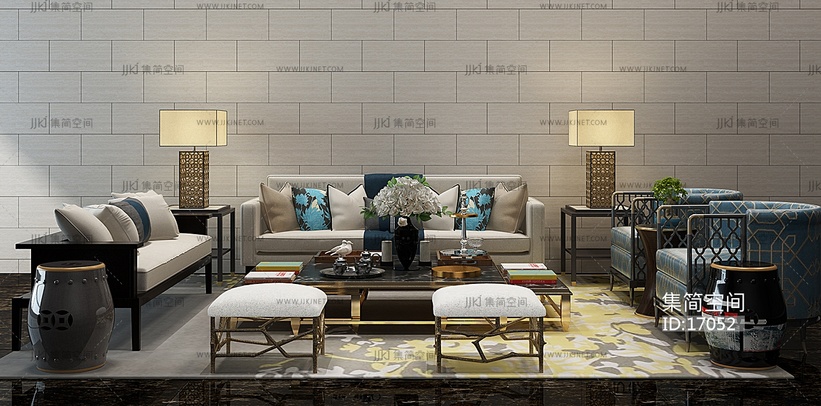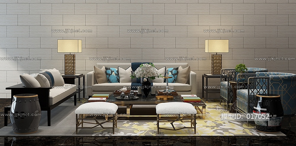 H04-0117新中式沙发茶几鼓凳 3d模型下载 [模型ID:17052]