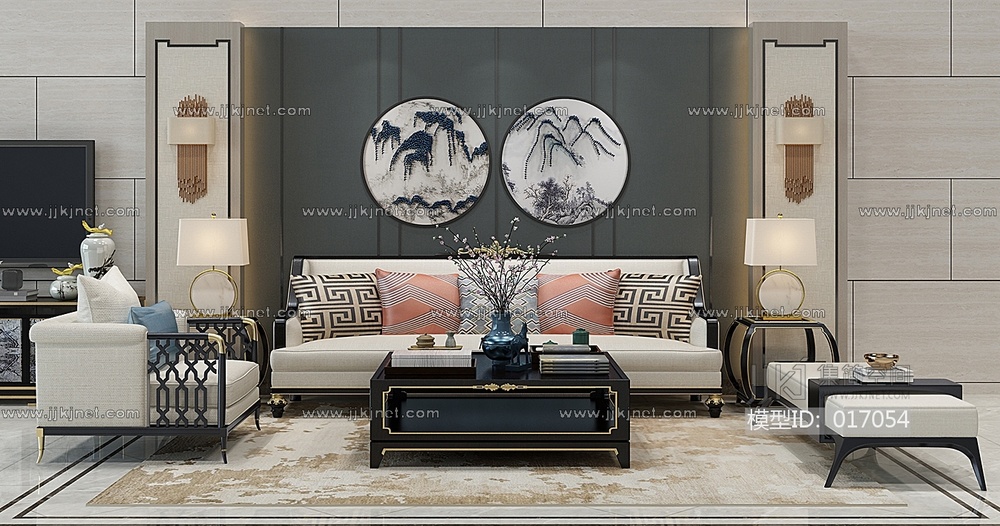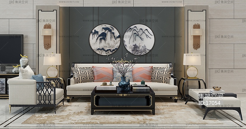 H06-0117新中式沙发茶几电视柜台灯中式画组合 3d模型下载 [模型ID:17054]