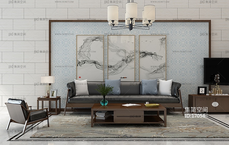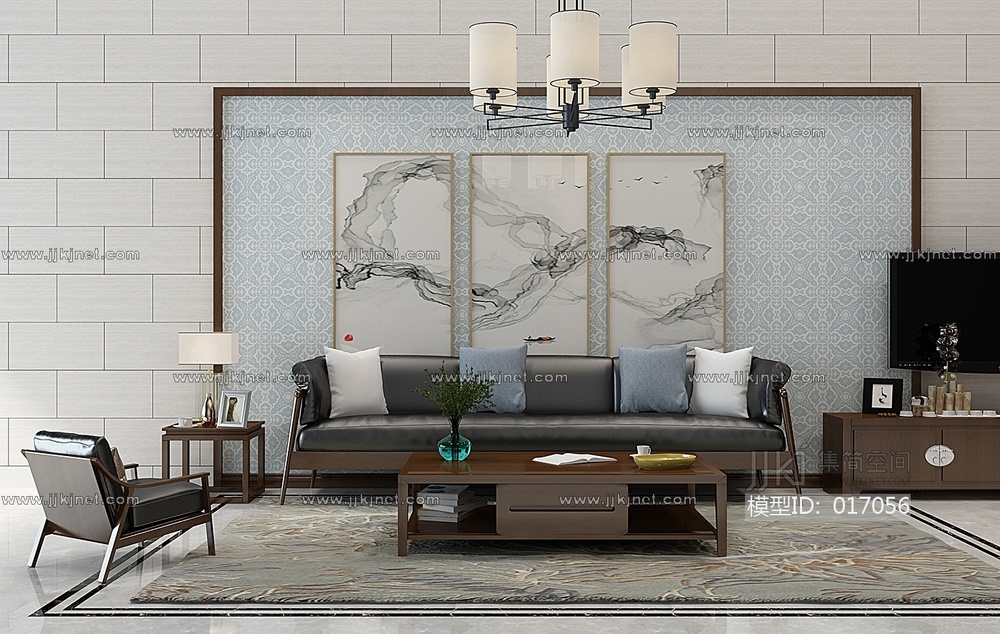 H08-0117新中式沙发茶几电视柜吊灯组合 3d模型下载 [模型ID:17056]