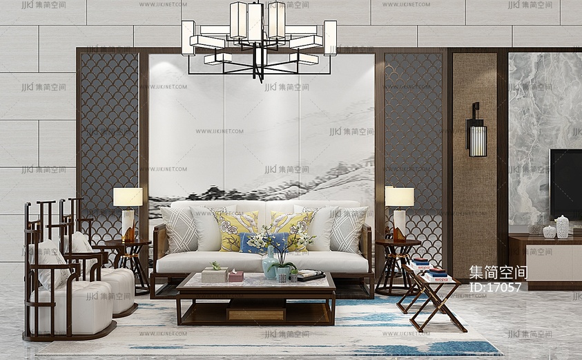 H09-0117新中式沙发茶几椅子电视柜吊灯组合 3d模型下载 [模型ID:17057]