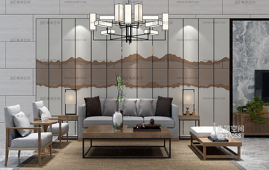 H10-0117新中式沙发茶几屏风吊灯组合 3d模型下载 [模型ID:17058]