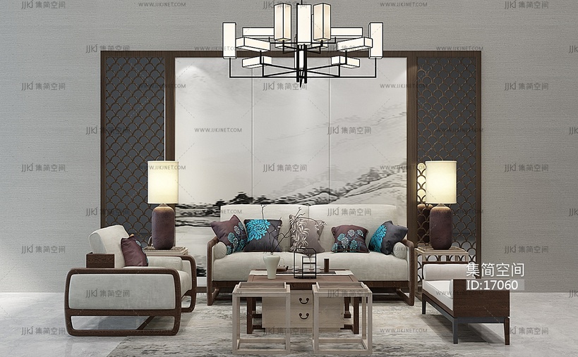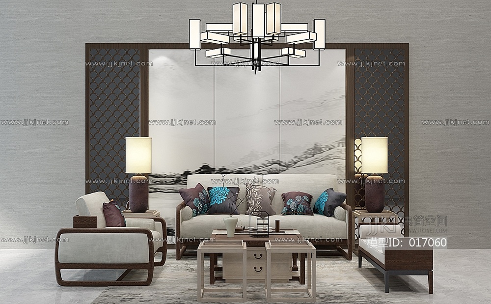 H12-0117新中式沙发茶几吊灯组合 3d模型下载 [模型ID:17060]