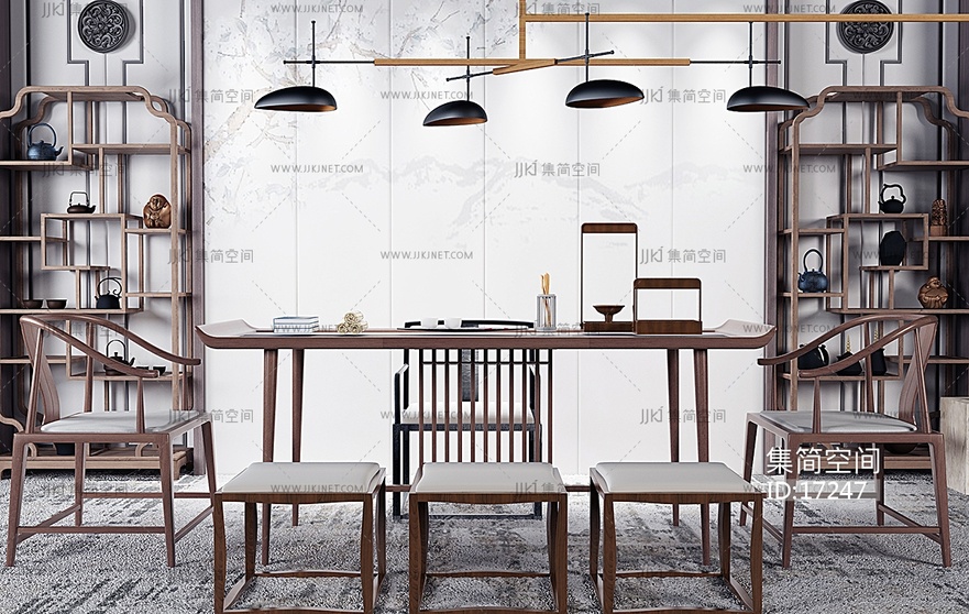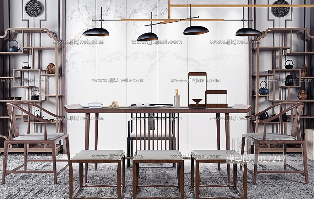 H04-0107新中式书桌椅茶桌椅装饰架多宝阁 3d模型下载 [模型ID:17247]