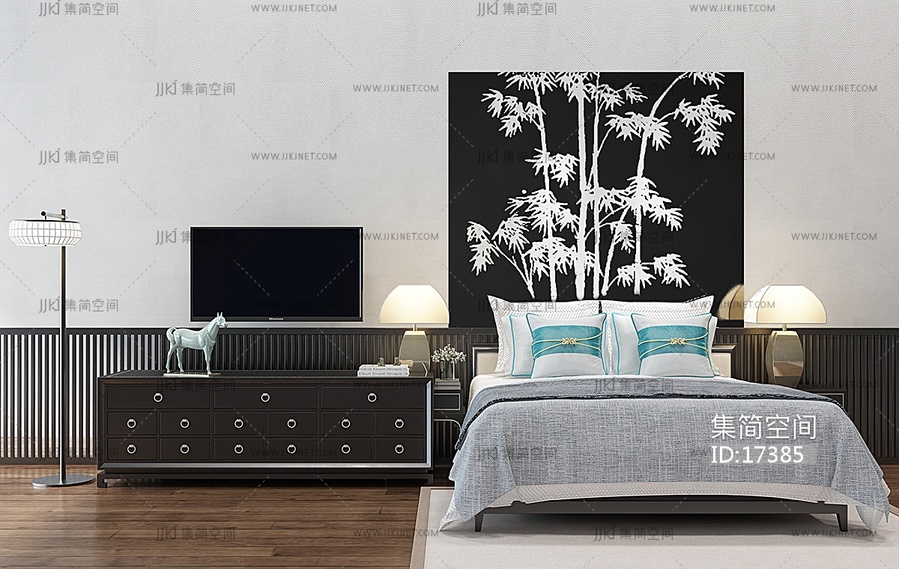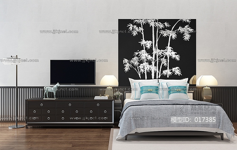 H03-0123新中式床电视柜床头柜卧室客房 3d模型下载 [模型ID:17385]