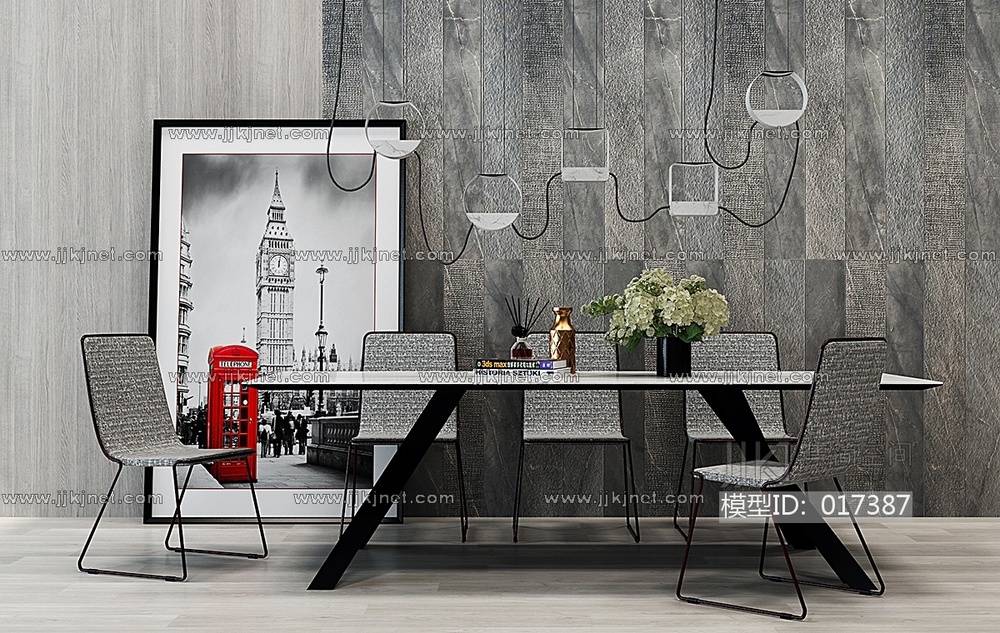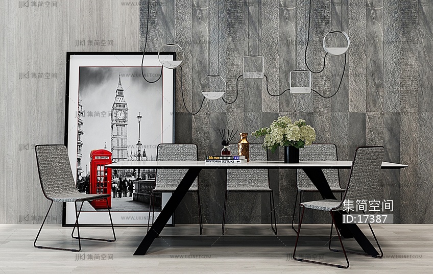 H05-0123工业风餐桌椅吊灯花瓶组合 3d模型下载 [模型ID:17387]