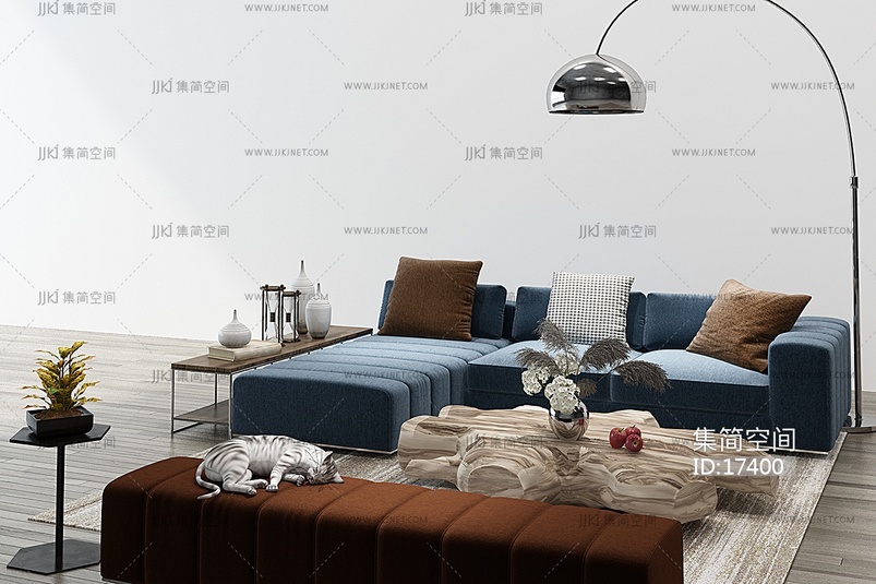 H05-0124现代沙发木墩茶几边几摆件组合 3d模型下载 [模型ID:17400]