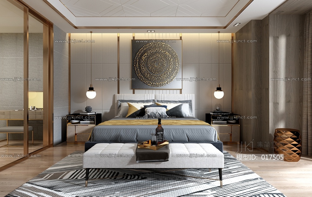 卧室,轻奢,暗黑风,现代轻奢卧室双人床,懒人沙发法式卧室3d模型下载