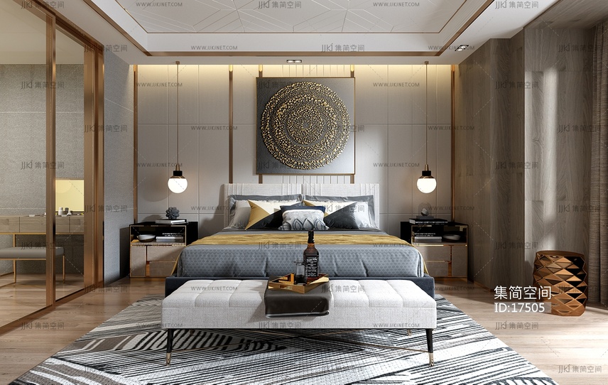 H27-0114现代轻奢卧室床床头柜鼓凳化妆台梳妆台 3d模型下载 [模型ID:17505]