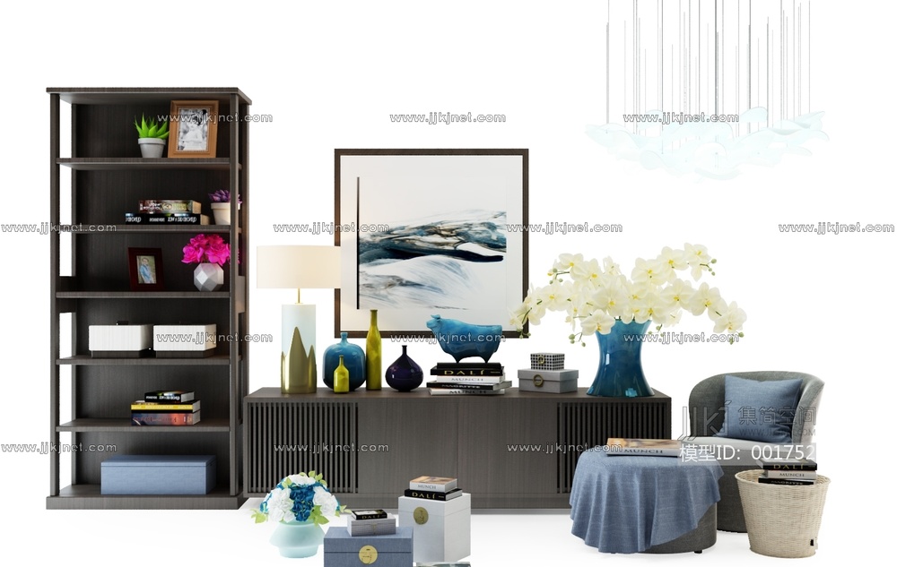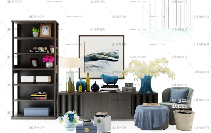 13 新中式电视柜书架休闲椅组合 3d模型下载 [模型ID:1752]