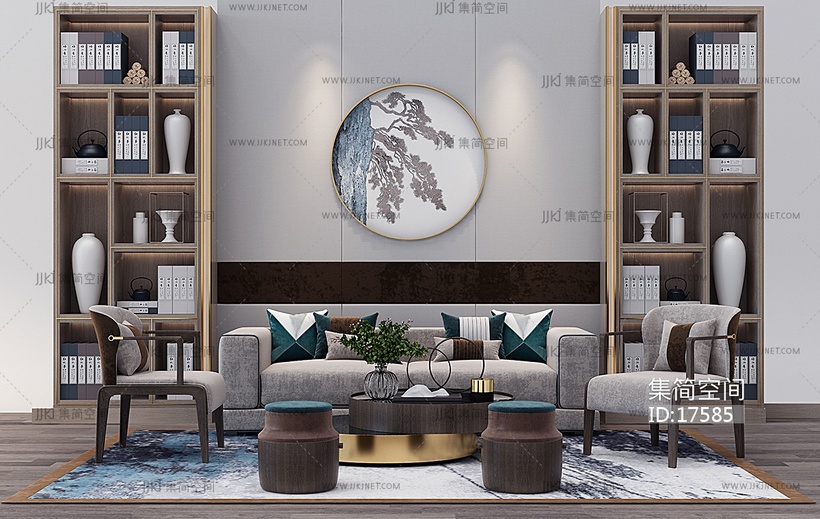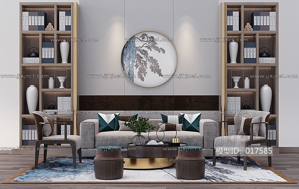 Z23-0107新中式沙发茶几圆墩沙发蹲椅子书柜组合 3d模型下载 [模型ID:17585]