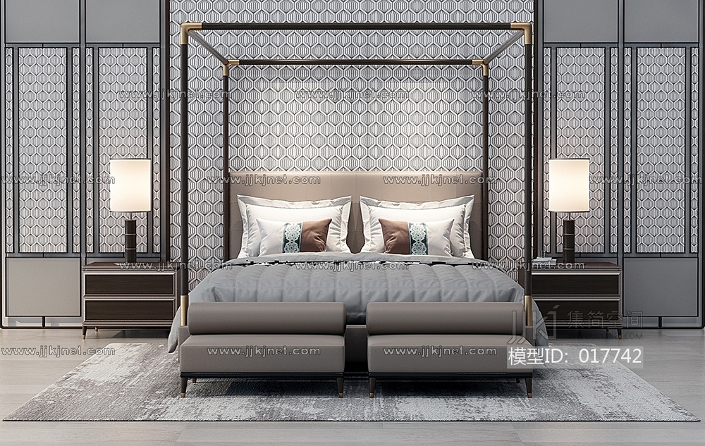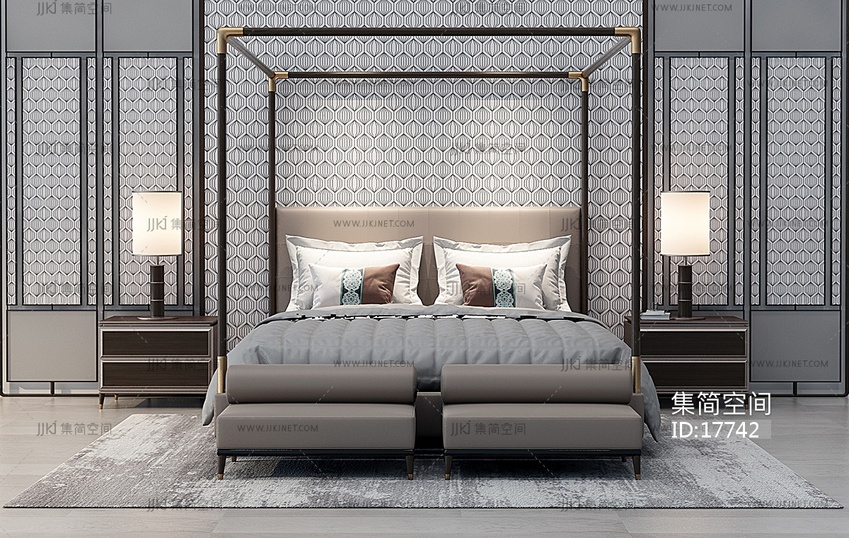 Z17-0111新中式架子床台灯床头柜组合 3d模型下载 [模型ID:17742]