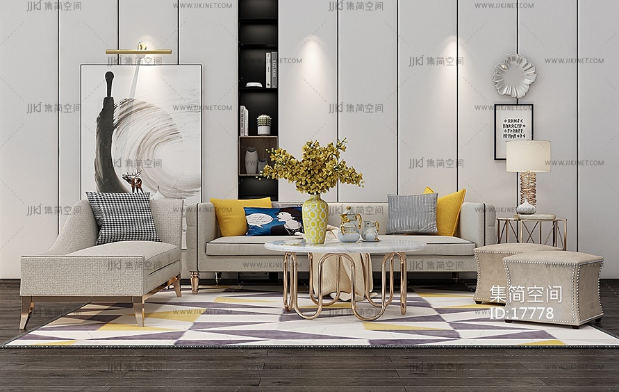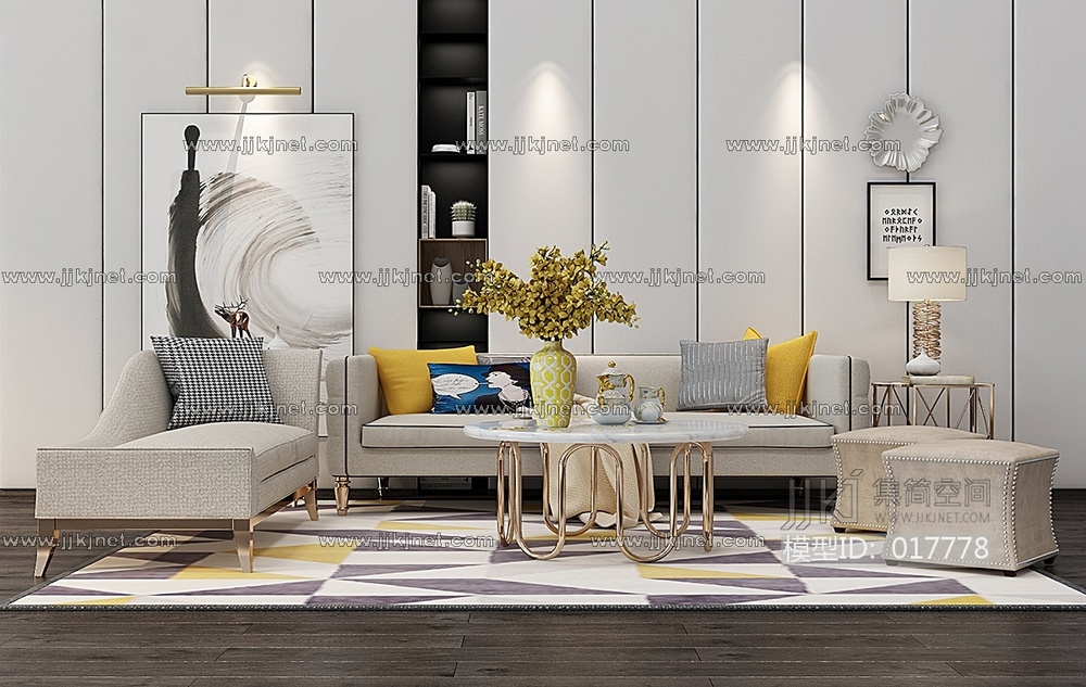 Z24-0112简欧现代沙发茶几贵妃榻茶几台灯花瓶 3d模型下载 [模型ID:17778]