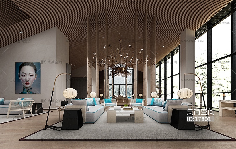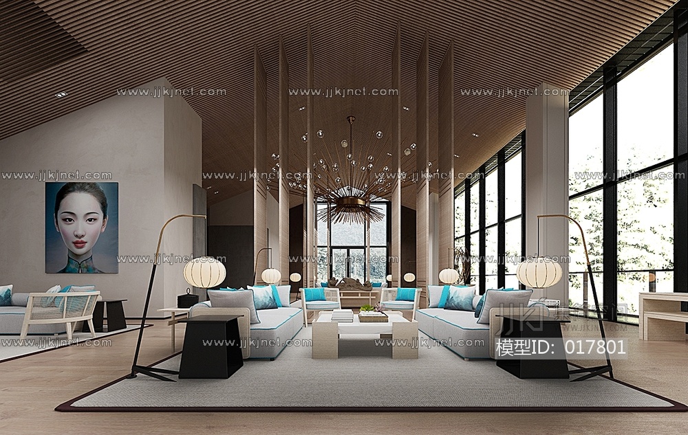 Z07-0124新中式酒店接待区沙发茶几落地灯 3d模型下载 [模型ID:17801]