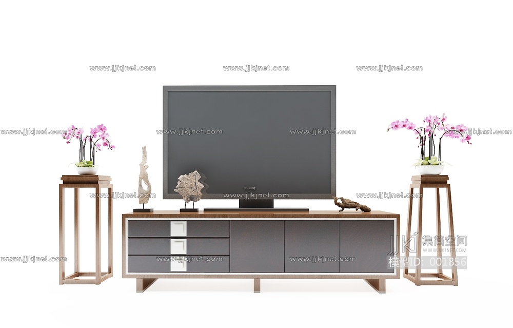 现代电视背景墙,满墙电视柜,电视机,储物柜,饰品摆件3D模型3d模型下载