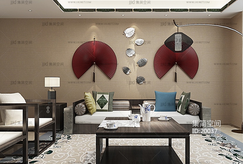H05-0212新中式沙发茶几椅子扇子挂饰组合 3d模型下载 [模型ID:20037]