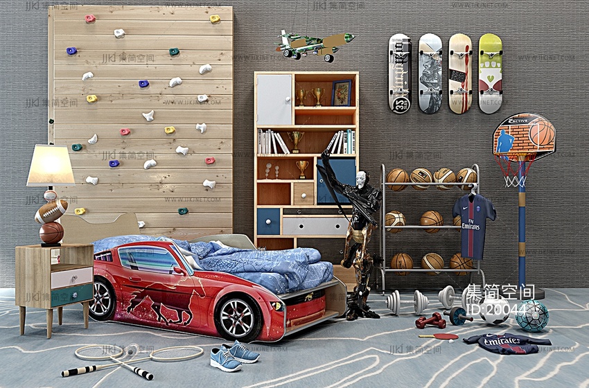 H13-0212男孩房床具儿童房玩具滑板车足球床头柜台灯攀岩墙机器人 3d模型下载 [模型ID:20044]