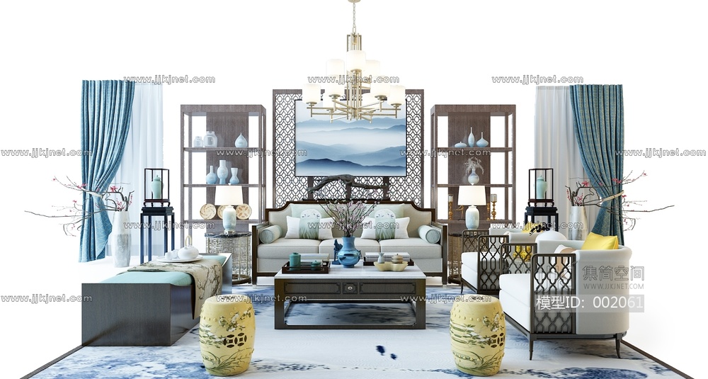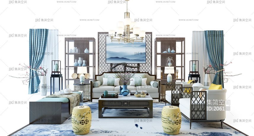 G88-17中式沙发组合圆墩书柜 3d模型下载 [模型ID:2061]