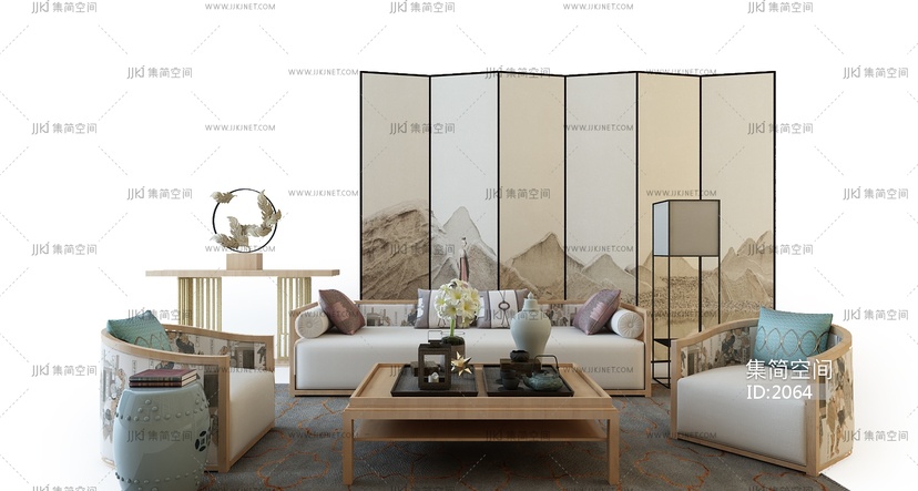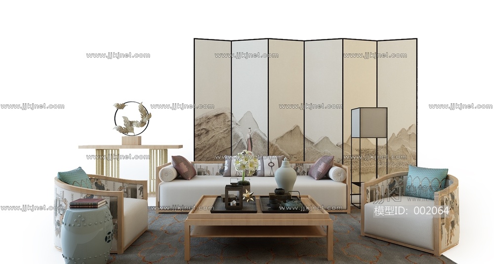 L01-17新中式沙发组合屏风 3d模型下载 [模型ID:2064]