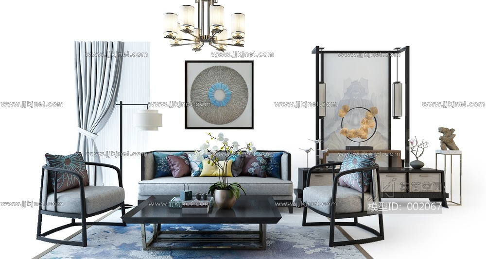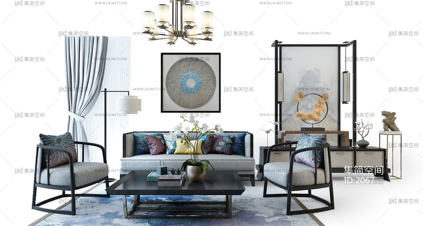 L04-16现代中式沙发组合电视柜玄关柜 3d模型下载 [模型ID:2067]