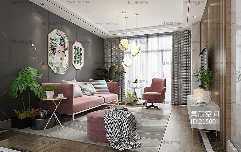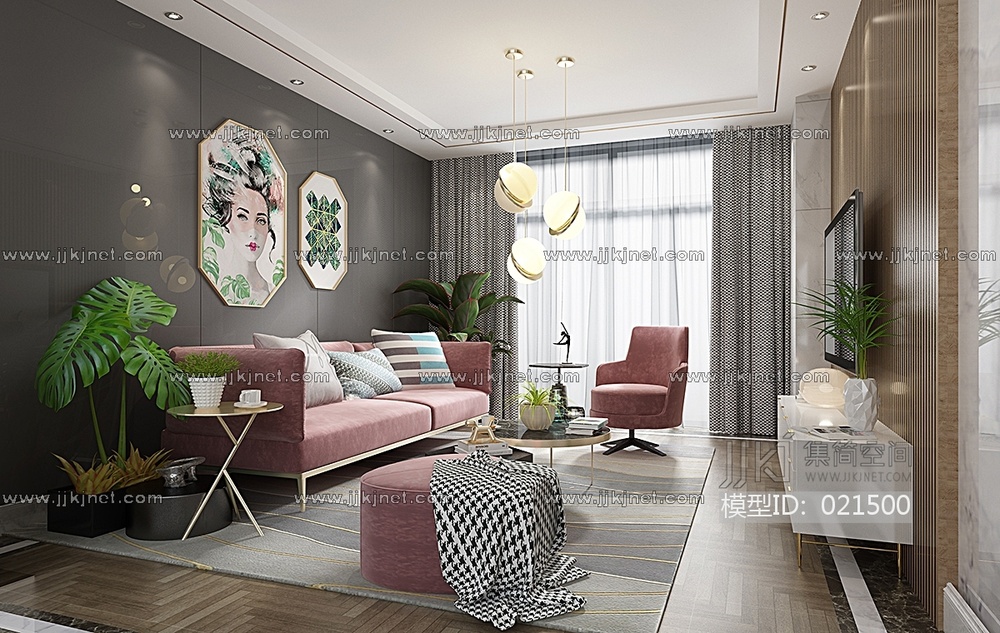 H07-0221北欧粉色客厅沙发茶几吊灯 3d模型下载 [模型ID:21500]