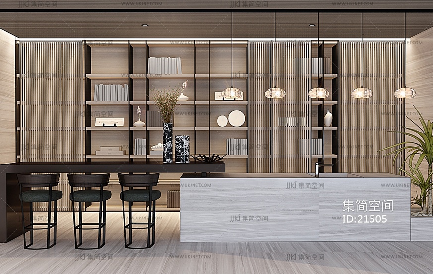 H03-0222新中式现代水吧台吧椅书柜 3d模型下载 [模型ID:21505]