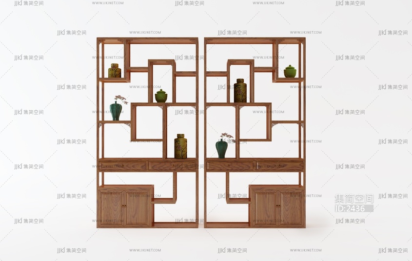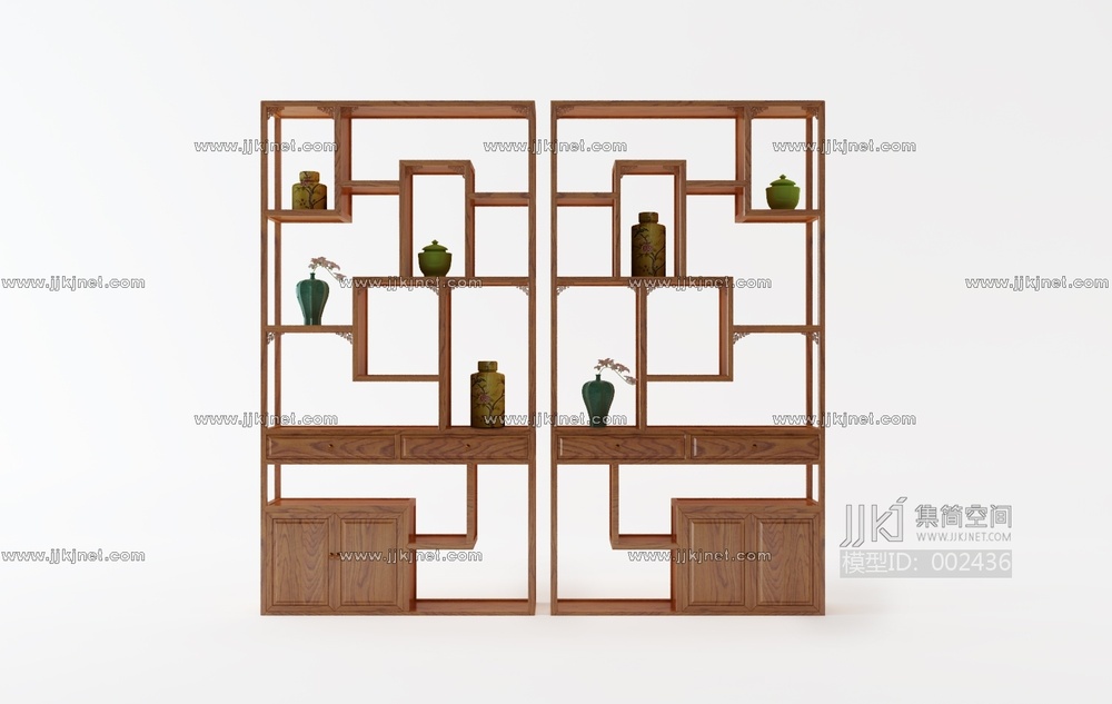 X17-323中式实木博古架陶瓷摆件组合 3d模型下载 [模型ID:2436]