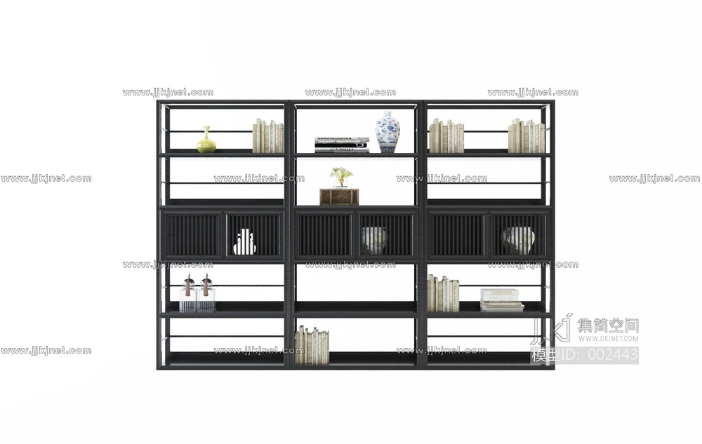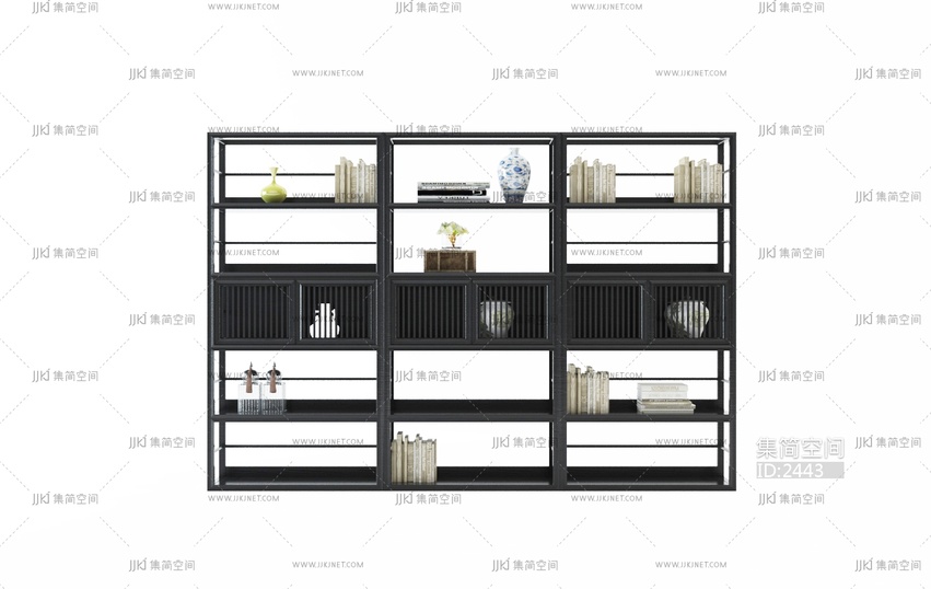 X24-323中式实木装饰架花瓶书籍组合 3d模型下载 [模型ID:2443]