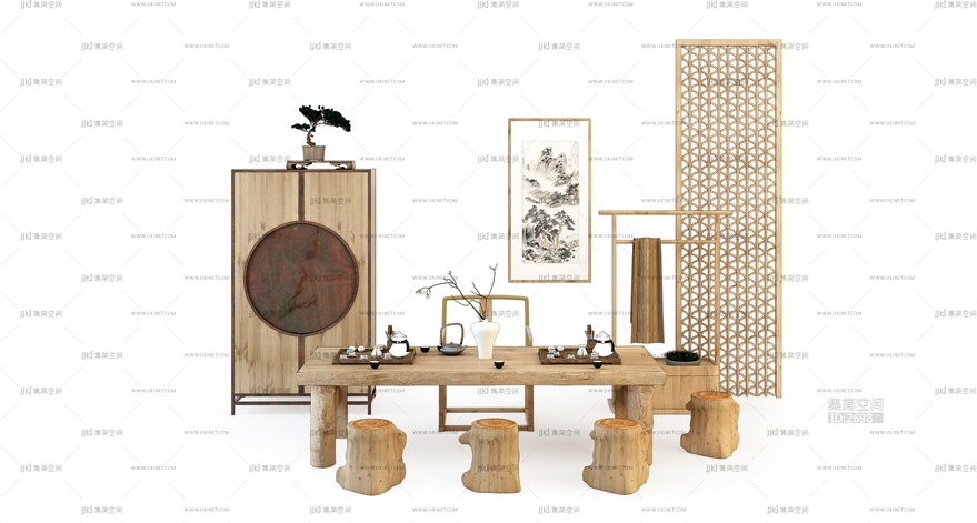 -侘寂茶桌椅组合_根雕_茶台_松树 3d模型下载