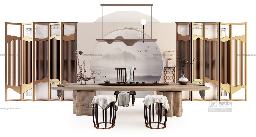 H010-0404中式茶台屏风吊灯摆件组合 3d模型下载 [模型ID:2706]